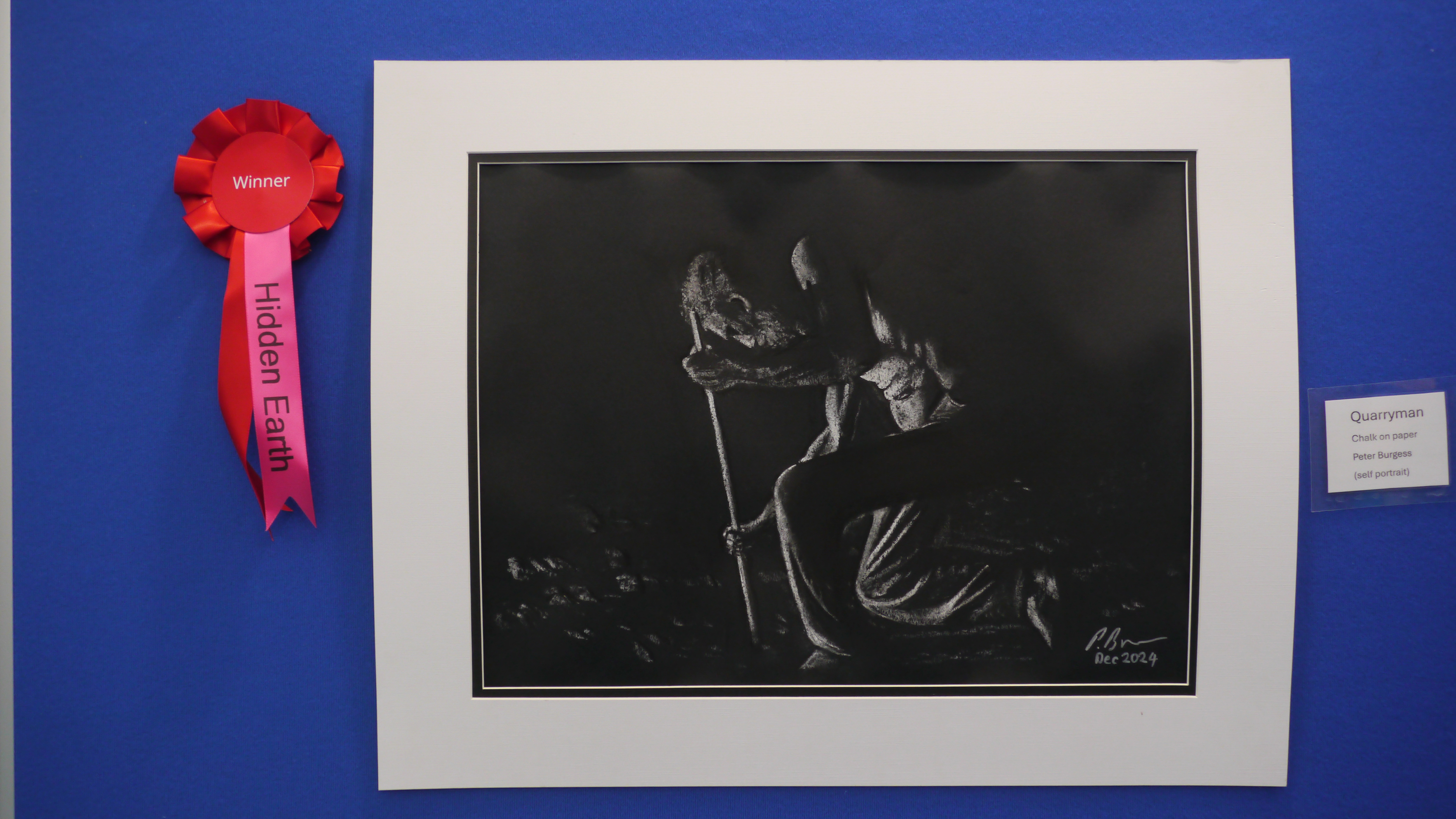 | Art Salon | Judged Art | Winner | Peter Burgess | Quarryman Self Portrait | Art book donated by Julie Jones, a sculpture from Ceris Jones artwork, a tackle bag from Warmbac and a choice of caving club bednights | ArtW-Burgess |